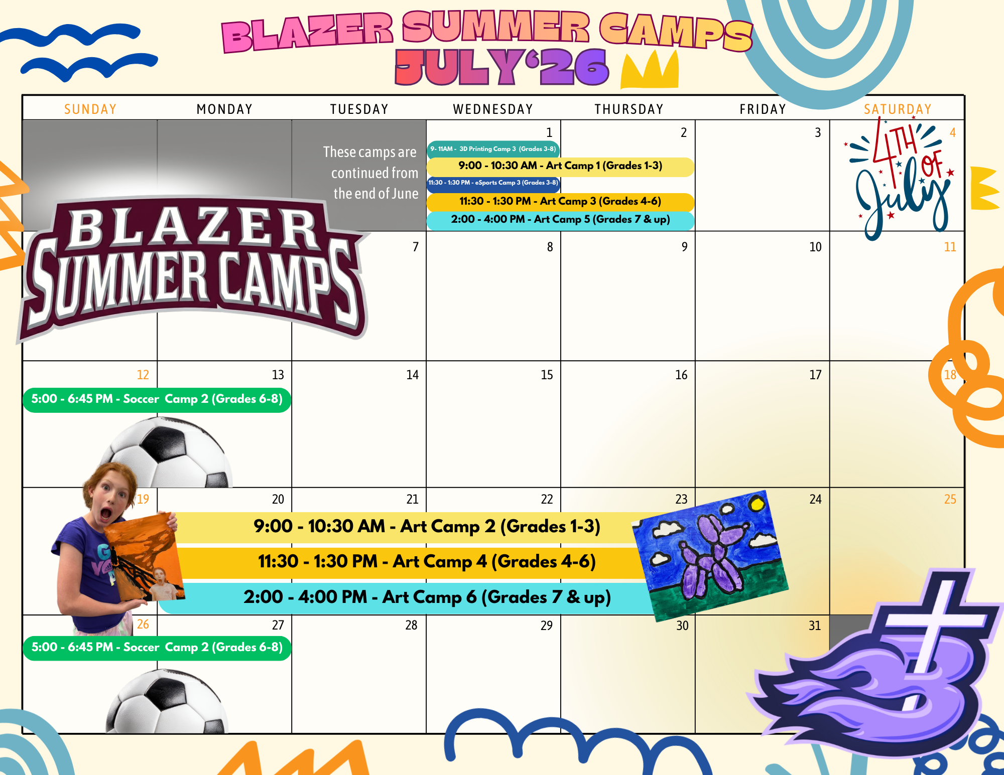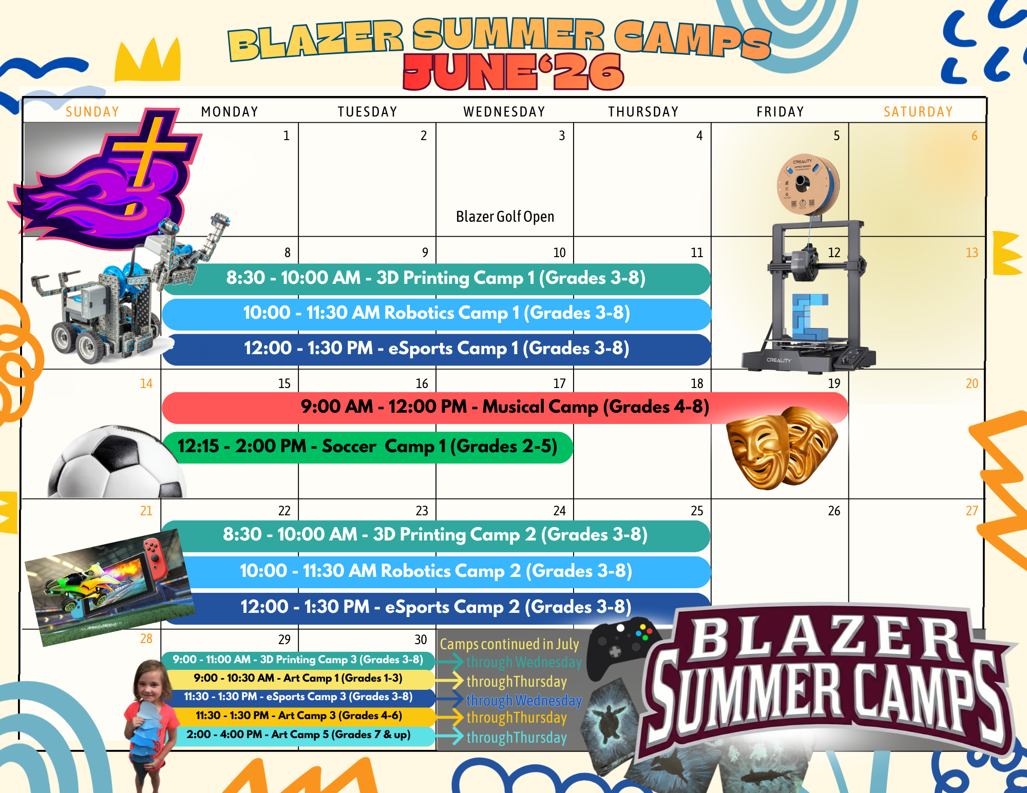 3-D Printing, Art, eSports, Musical, Robotics, Soccer, Volleyball (Sparks, Season Opener & Team) (Basketball Camp dates will be added.)